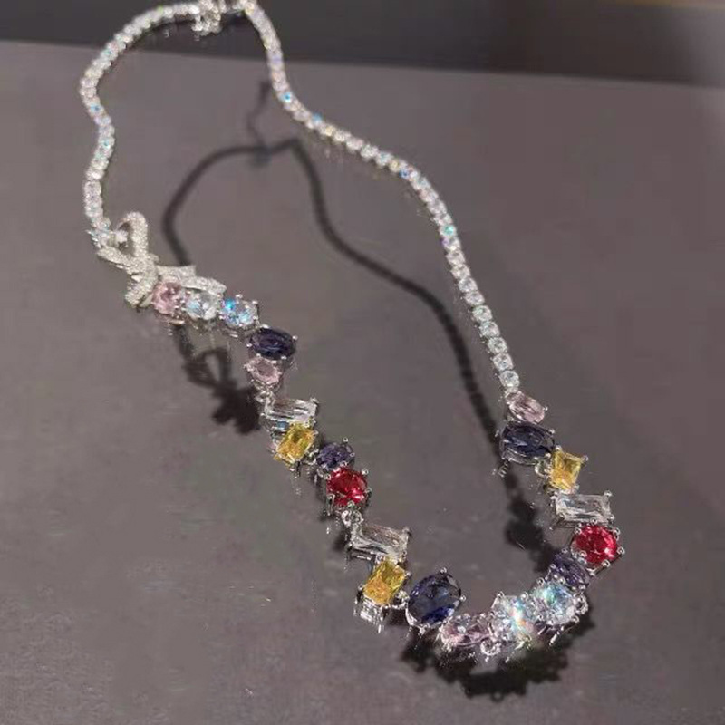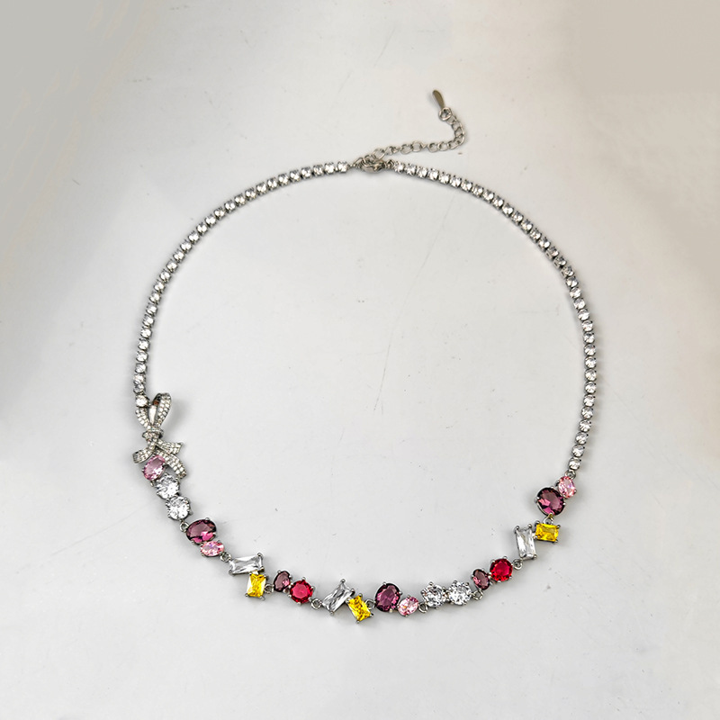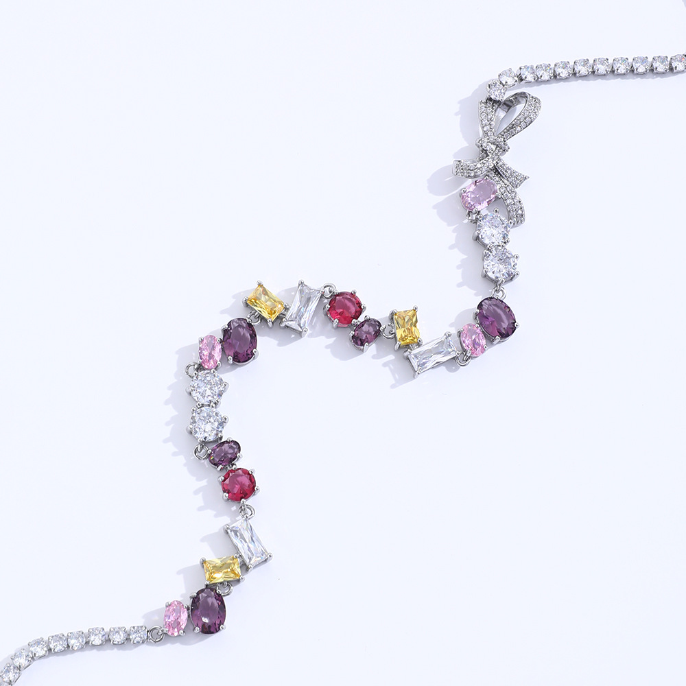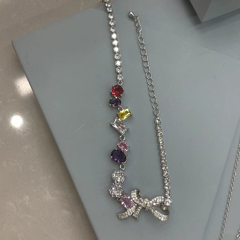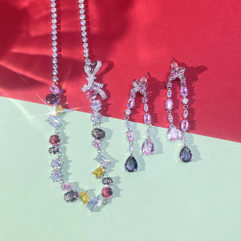 Color: colored diamond bow necklace, tassel drop earrings, colored diamond bow bracelet