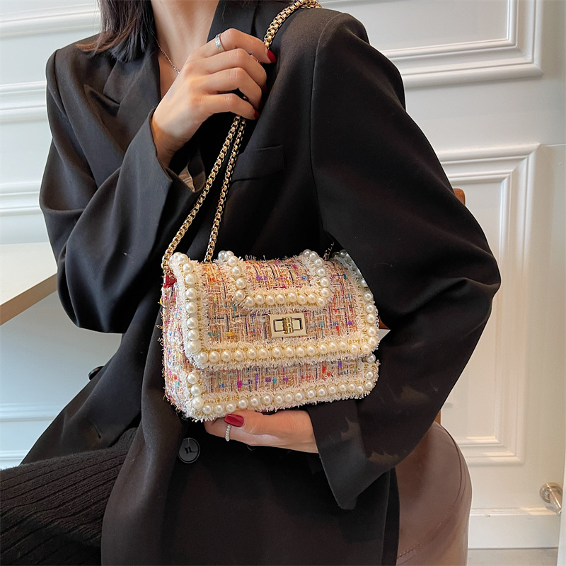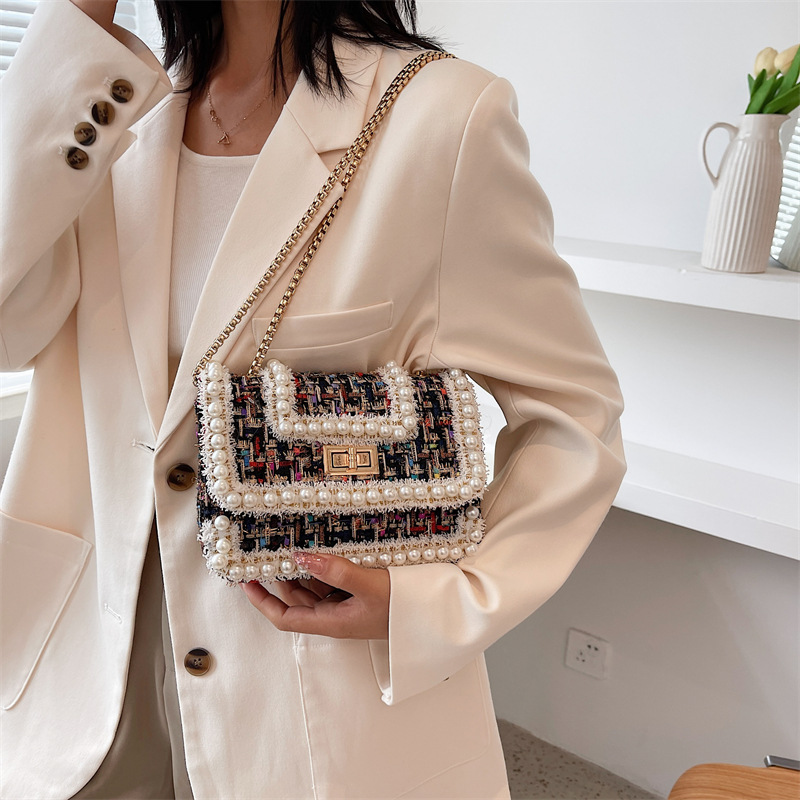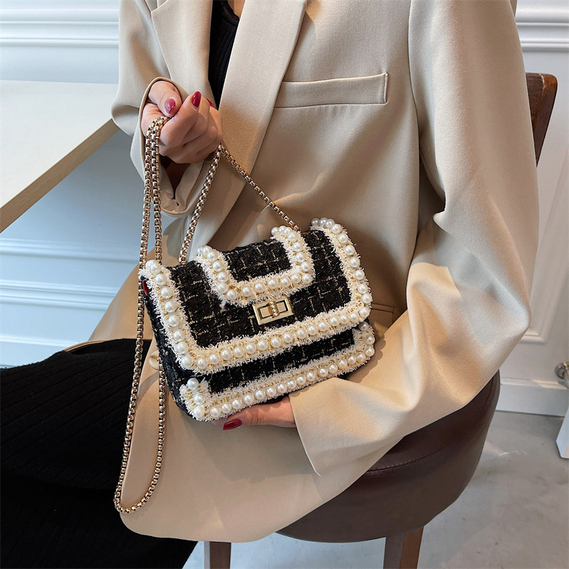 Woolen Houndstooth Pearl Personalized Chain Messenger Bag